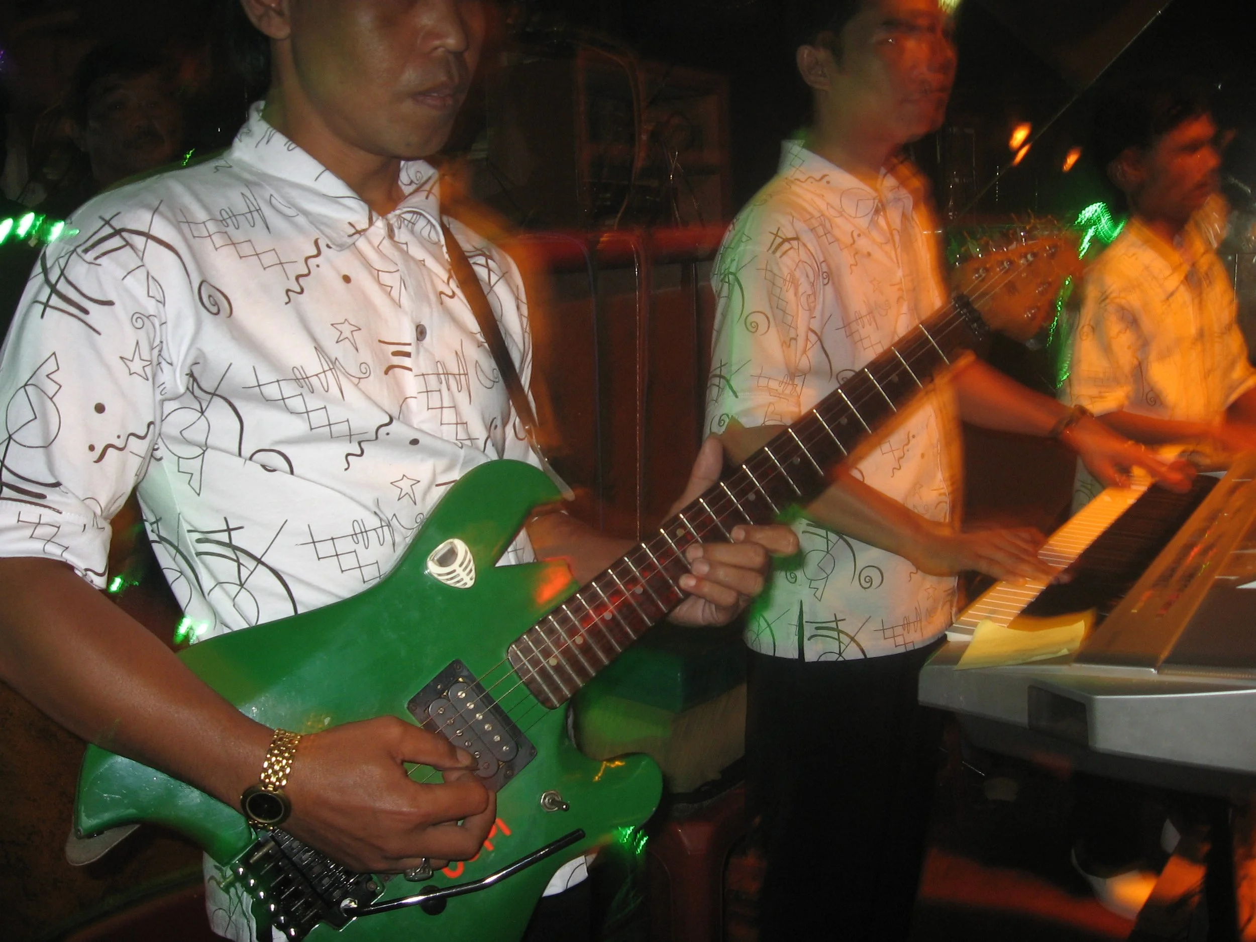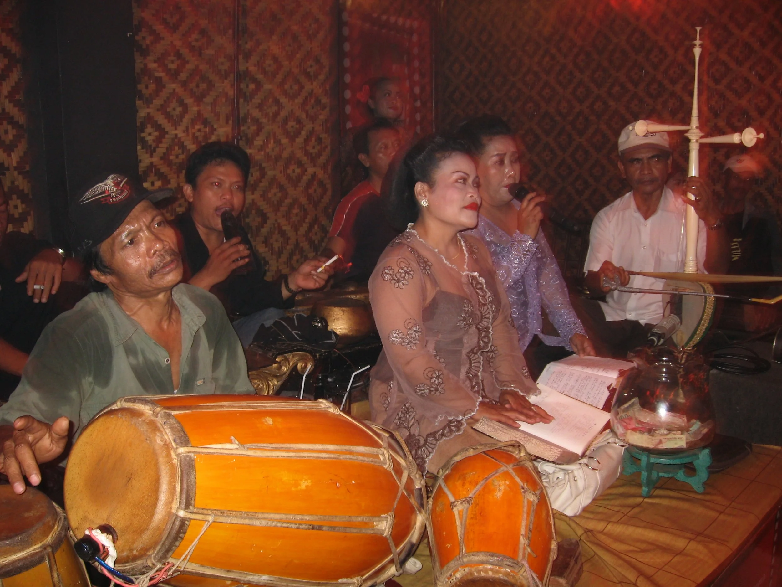 the popular music known as dangdut can be heard echoing from dance clubs where singers pass the microphone, the band plays the hits, and the crowd dances along to the signature drum sound,”dang-dut,”